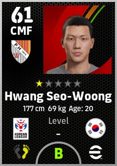 . Hwang Seo-Woong is a Center Midfielder footballer from Korea Republic who plays for Pohang Rb in eFootball 2026.