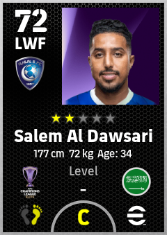 . Salem Al Dawsari is a Left Wing Forward footballer from Saudi Arabia who plays for Al Hilal Sfc in eFootball 2026.