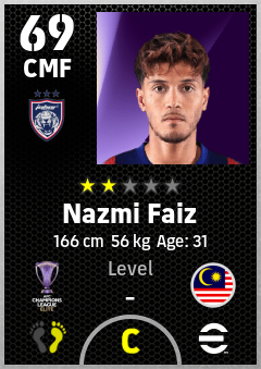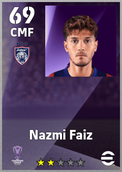 . Nazmi Faiz is a Center Midfielder footballer from Malaysia who plays for Johor Darul Ta'zim Fc in eFootball 2026.