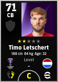 . Timo Letschert is a Center Back footballer from Netherlands who plays for Chengdu Rongcheng Fc in eFootball 2026.