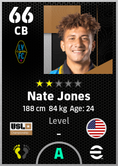 . Nate Jones is a Center Back footballer from United States who plays for Las Vegas Lights Fc in eFootball 2026.