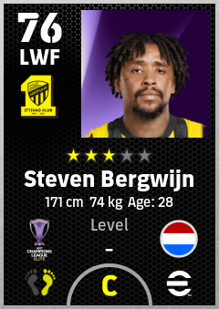 . Steven Bergwijn is a Left Wing Forward footballer from Netherlands who plays for Al Ittihad Club in eFootball 2026.