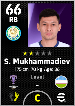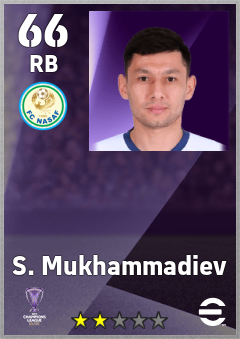 . S. Mukhammadiev is a Right Back footballer from Uzbekistan who plays for Fc Nasaf in eFootball 2026.