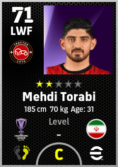 . Mehdi Torabi is a Left Wing Forward footballer from Ir Iran who plays for Tractor Fc in eFootball 2026.