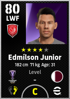 . Edmílson Junior is a Left Wing Forward footballer from Qatar who plays for Al Duhail Sc in eFootball 2026.