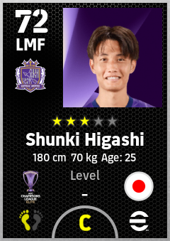 . Shunki Higashi is a Left Midfielder footballer from Japan who plays for Sanfrecce Hiroshima in eFootball 2026.