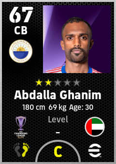 . Abdalla Ghanim is a Center Back footballer from United Arab Emirates who plays for Sharjah Fc in eFootball 2026.