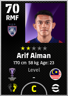 . Arif Aiman is a Right Midfielder footballer from Malaysia who plays for Johor Darul Ta'zim Fc in eFootball 2026.