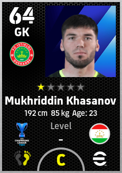. Mukhriddin Khasanov is a Goalkeeper footballer from Tajikistan who plays for Fc Istiklol Dushanbe in eFootball 2026.