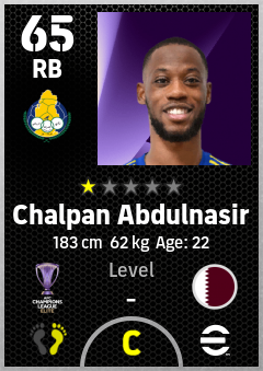 . Chalpan Abdulnasir is a Right Back footballer from Qatar who plays for Al Gharafa Sc in eFootball 2026.