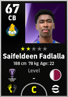 . Saifeldeen Fadlalla is a Center Back footballer from Qatar who plays for Al Gharafa Sc in eFootball 2026.