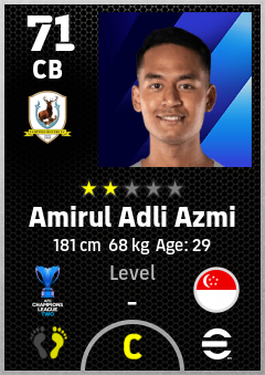 . Amirul Adli Azmi is a Center Back footballer from Singapore who plays for Tampines Rovers Fc in eFootball 2026.