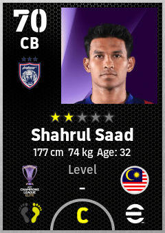 . Shahrul Saad is a Center Back footballer from Malaysia who plays for Johor Darul Ta'zim Fc in eFootball 2026.