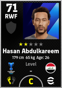 . Hasan Abdulkareem is a Right Wing Forward footballer from Iraq who plays for Al Zawraa Sc in eFootball 2026.