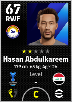 . Hasan Abdulkareem is a Right Wing Forward footballer from Iraq who plays for Al Zawraa Sc in eFootball 2026.