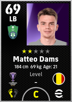 . Matteo Dams is a Left Back footballer from Belgium who plays for Al Ahli Saudi Fc in eFootball 2026.