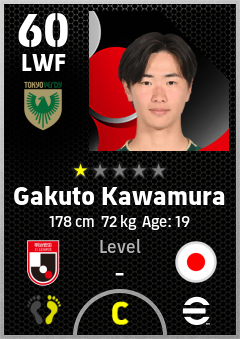 . Gakuto Kawamura is a Left Wing Forward footballer from Japan who plays for Tokyo Verdy in eFootball 2026.
