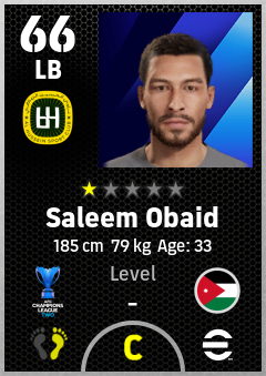 . Saleem Obaid is a Left Back footballer from Jordan who plays for Al Hussein Sc in eFootball 2026.