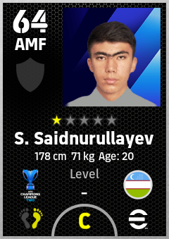 . S. Saidnurullayev is a Attacking Midfielder footballer from Uzbekistan who plays for Fc Andijan in eFootball 2026.