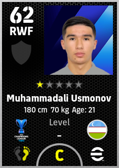 . Muhammadali Usmonov is a Right Wing Forward footballer from Uzbekistan who plays for Fc Andijan in eFootball 2026.