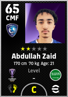 . Abdullah Zaid is a Center Midfielder footballer from Saudi Arabia who plays for Al Hilal Sfc in eFootball 2026.