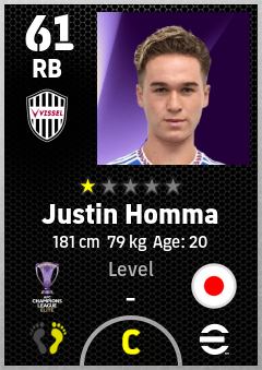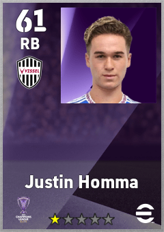 . Justin Homma is a Right Back footballer from Japan who plays for Vissel Kobe in eFootball 2026.