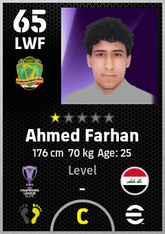 . Ahmed Farhan is a Left Wing Forward footballer from Iraq who plays for Al Shorta Sc in eFootball 2026.
