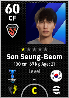 . Son Seung-Beom is a Center Forward footballer from Korea Republic who plays for Fc Pohang Steelers in eFootball 2026.