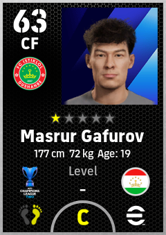 . Masrur Gafurov is a Center Forward footballer from Tajikistan who plays for Fc Istiklol Dushanbe in eFootball 2026.