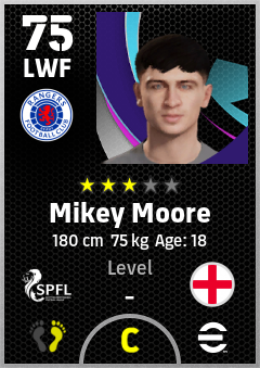. Mikey Moore is a Left Wing Forward footballer from England who plays for Rangers Fc in eFootball 2026.