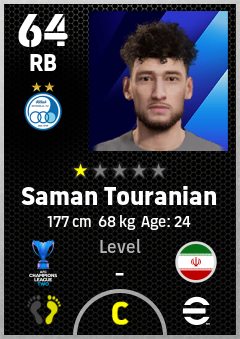 . Saman Touranian is a Right Back footballer from Ir Iran who plays for Esteghlal Fc in eFootball 2026.
