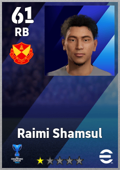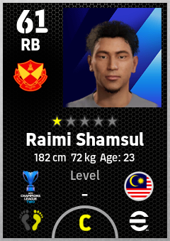 . Raimi Shamsul is a Right Back footballer from Malaysia who plays for Selangor Fc in eFootball 2026.