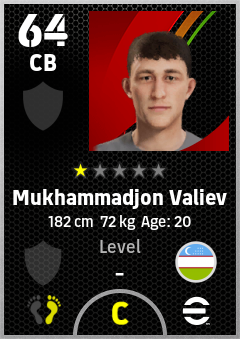 . Mukhammadjon Valiev is a Center Back footballer from Uzbekistan who plays for Free in eFootball 2026.