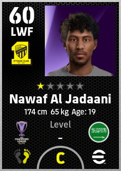 . Nawaf Al Jadaani is a Left Wing Forward footballer from Saudi Arabia who plays for Al Ittihad Club in eFootball 2026.