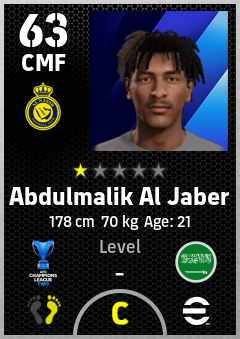 . Abdulmalik Al Jaber is a Center Midfielder footballer from Saudi Arabia who plays for Al Nassr Fc in eFootball 2026.