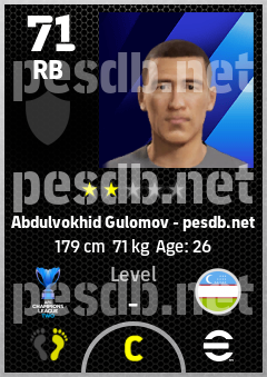 . Abdulvokhid Gulomov is a Right Back footballer from Uzbekistan who plays for Fc Andijan in eFootball 2026.