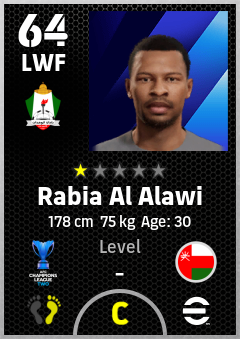 . Rabia Al Alawi is a Left Wing Forward footballer from Oman who plays for Al Wehdat Sc in eFootball 2026.