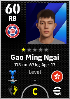 . Gao Ming Ngai is a Right Back footballer from Hong Kong, China who plays for Eastern Sc in eFootball 2026.