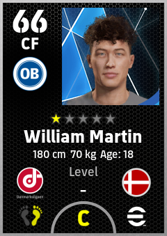 . William Martin is a Center Forward footballer from Denmark who plays for Odense Hb in eFootball 2026.