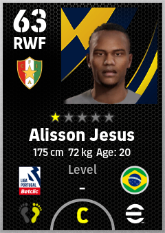 . Alisson Jesus is a Right Wing Forward footballer from Brazil who plays for Cf Estrela Da Amadora in eFootball 2026.