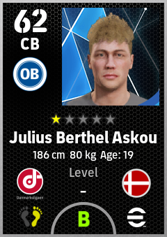 . Julius Berthel Askou is a Center Back footballer from Denmark who plays for Odense Hb in eFootball 2026.