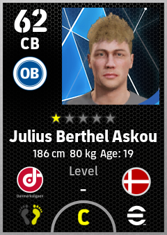 . Julius Berthel Askou is a Center Back footballer from Denmark who plays for Odense Hb in eFootball 2026.