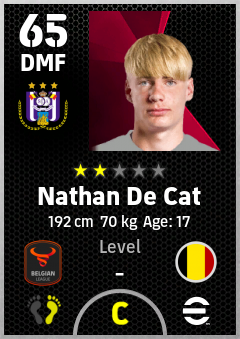 . Nathan De Cat is a Defensive Midfielder footballer from Belgium who plays for Anderlecht Pw in eFootball 2026.