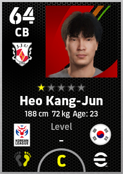 . Heo Kang-Jun is a Center Back footballer from Korea Republic who plays for Jeju O in eFootball 2026.