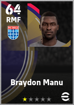 . Braydon Manu is a Right Midfielder footballer from Ghana who plays for Pec Zwolle in eFootball 2026.