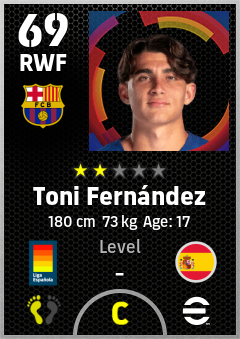 . Toni Fernández is a Right Wing Forward footballer from Spain who plays for Fc Barcelona in eFootball 2026.