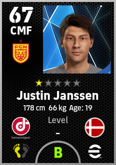 . Justin Janssen is a Center Midfielder footballer from Denmark who plays for Nordsjælland Rg in eFootball 2026.