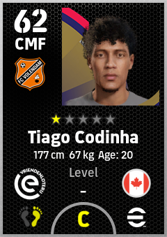. Tiago Codinha is a Center Midfielder footballer from Canada who plays for Fc Volendam in eFootball 2026.