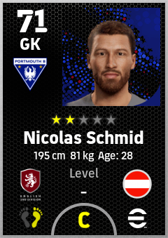 . Nicolas Schmid is a Goalkeeper footballer from Austria who plays for Portsmouth B in eFootball 2026.