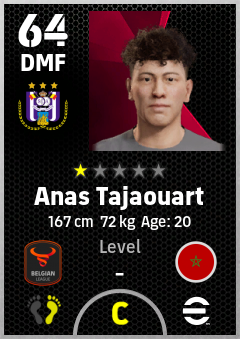 . Anas Tajaouart is a Defensive Midfielder footballer from Morocco who plays for Anderlecht Pw in eFootball 2026.